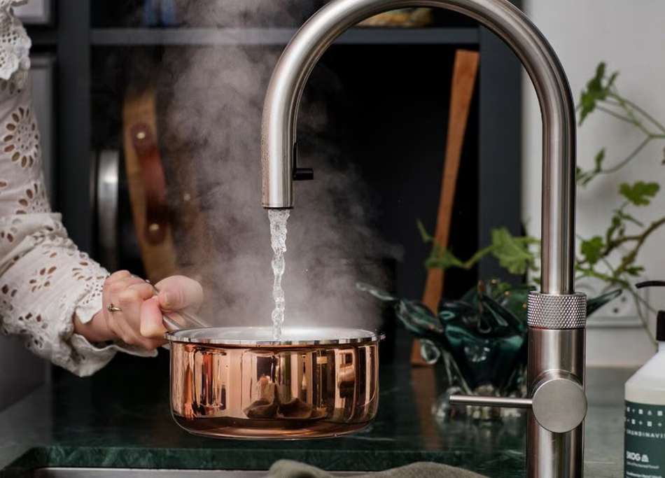 Et kjøkken med pålitelig varmtvann og moderne armaturer. Kundene fikk trygghet og god funksjonalitet.